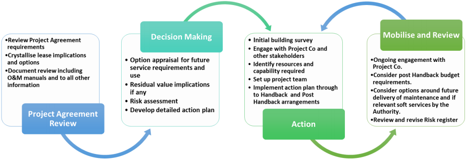 4.1 The following flowchart illustrates the Handback process through to the post Handback Period and identifies key actions flowing from a review of the contract documentation, through an option appraisal and decision making phase to implementing an action plan, while ensuring a process of review as the project proceeds: