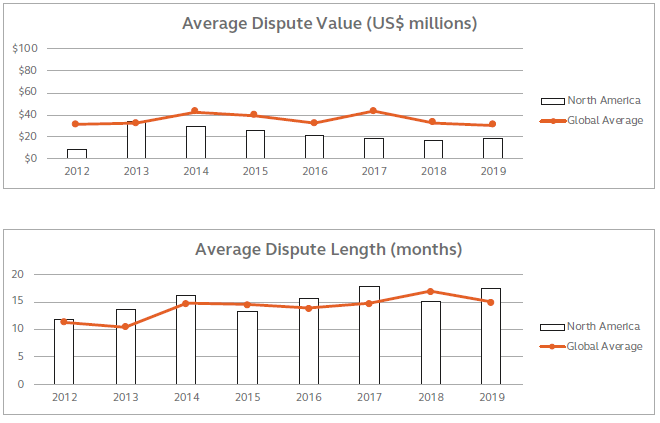 Dispute values, durations and volume all increased over the past year in North America. After continuously dropping since 2013, the value of disputes rose from $16.3 million to $18.8 million. The average time taken to resolve construction disputes for North America increased from 15.2 months in 2018 to 17.6 months in 2019. Overall, North America saw the volume of construction disputes increase compared to 2018, and the majority of participants in our survey expect this number to increase in 2020. With COVID-19's impact on the construction industry, we expect a further increase in claims related to delays and increased costs on projects. It is very difficult to predict the true widespread impact of this global pandemic, but with construction projects shutting down in some areas of North America, we know that projects will experience delays and disruption.
