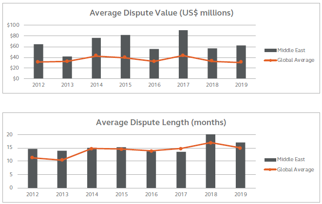 The average value of disputes in the Middle East increased slightly to $57 million in 2018 to $62 million in 2019. Also, the average length of time needed to resolve a dispute decreased to 17 months, compared to 20 months in 2018. This decrease is likely attributed to the liable parties and participants in the dispute process realizing that slowing down the dispute resolution process is in no one's long-term interest, and that moving forward the claimants are not capable of withstanding long periods of time of uncertainty on the conclusion of their disputed amounts.