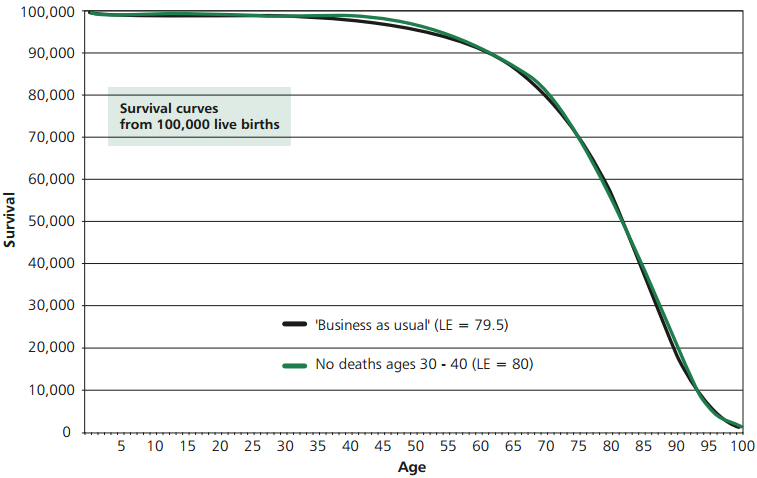 A2.48 For Social Cost Benefit Analysis involving risks to longevity, clarity is required concerning how length of life is affected by the risk or intervention. Longevity can be measured as life expectancy. This can be expressed as the area under a survival curve, which shows the likelihood of surviving to any given age, as illustrated in Figure 6. Life expectancy is a statistical expectation of the risk of dying at any given age, rather than a specific number of years. If for example a cohort of 100,000 people faced a 1% risk of dying aged 30 to 40, and an intervention could eliminate this risk, the intervention could be described as preventing 1,000 fatalities.