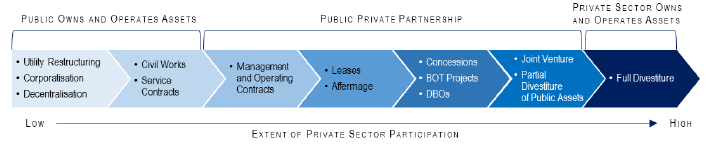 is a long-term contract between a private party and a public entity, for providing a public asset or service, in which the private party provides financing and bears significant risk and management responsibilities. Privately financed infrastructures are of two types with respect to their funding structure: the concession, in which the end-users bare the core of the payment cost of the infrastructure (user-pays PPPs), and the government-pays PPPs, in which the taxpayers bare the core of the payment cost.i |