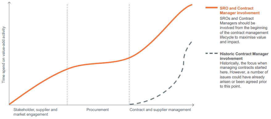 Supplier relationships and contract delivery also benefit from these relationships being established up front in the commercial lifecycle. Contract management activities should not wait for a contract award to start. Individuals responsible for performing these activities should ideally be involved from the outset to: gather and share lessons learned; confirm the contract is fit for purpose and appropriate resources are in place; inform the procurement process; and ensure a successful transition to service delivery (below):