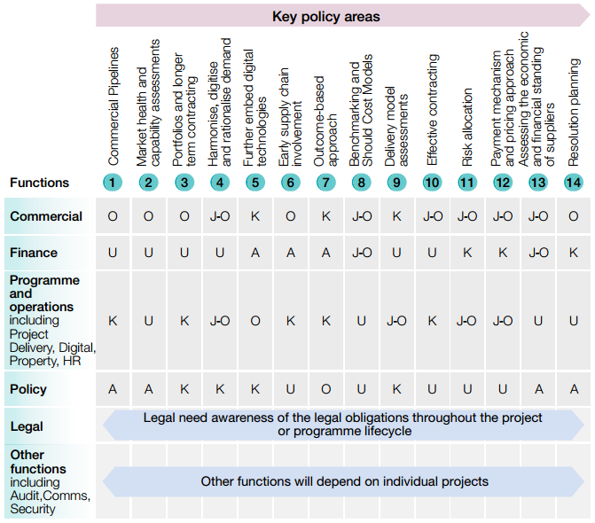 Figure 4 provides an analysis for the 14 key policies mapped against functional groups. This should be considered a guide to support contracting authorities in implementing the Construction Playbook and may vary in different contracting authorities depending on their structure.