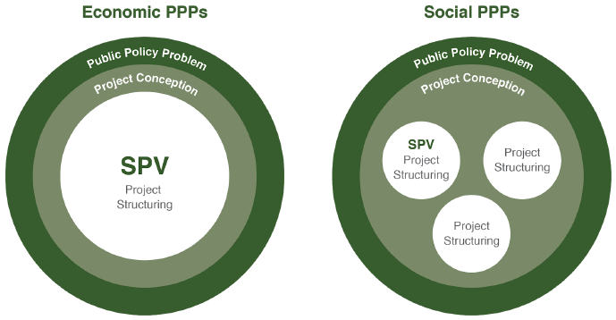 But while SPVs are commonplace in PPP structuring, the way that a project is structured can vary widely between economic and social PPPs. Let's examine the visualization on the opposite page. In this diagram, the relative area of each concentric circle corresponds-roughly, of course-to the degree of difficulty presented by each element of the PPP process. It's easy to see that economic and social PPPs present distinct challenges. As we can see, economic PPPs tend to be more straightforward. Once the problem is understood, most resources going towards solving the problem are contained in the structuring of a single project. Compare this to the diagram of a social PPP, in which project conception requires considerably more work, and often results in structuring multiple transactions, and thus multiple SPVs. Large-scale social PPP projects can actually result in many distinct SPVs, all within a single project. This is due to the fact that-without the clear promise of monetary returns to the private sector-social PPPs tend to be more delicate, and often require discrete, interconnected solutions to several distinct issues.