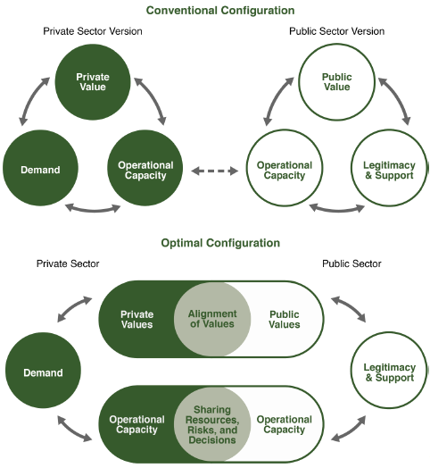 In the optimal configuration, not only is operational capacity shared between the public and private sectors, but so are values. In other words, partners are in agreement about both their methods and their goals. This type of configuration is far more effective for social PPPs and in situations where the economic returns may not be as clear or immediate. Without the promise of adequate financial returns to incentivize the private sector, a social PPP must be optimally configured to ensure that both parties share common goals. These goals may include the eventual realization of profits, but must include some form of value-otherwise the PPP will not be sustainable. Optimal configurations depend on sustaining an alignment of values over long time periods.