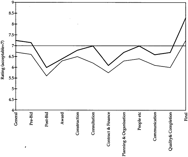 8.3 The interviewees were asked to score each of the answers against a prescribed 1 to 10 rating system. 7 was "acceptable", 6 "fair", 5 "poor". Below 5 was "very unsatisfactory", 8 was "better than acceptable, good" and 9 "very good". Most importantly, benchmarking was undertaken against other main contractors. The results showed:-