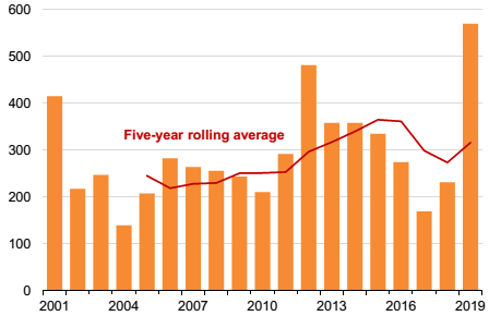 Figure 1.3: The average cost of completed projects leapt in 2019