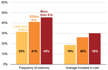 Frequency of overruns and average increase in cost as a percentage of initial project costs by level of initial cost