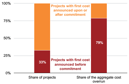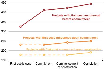 Projects with premature cost announcements exceed their promised cost by an average of 35 per cent; this is more than twice the percentage overrun (13 per cent) for projects that had their first cost announced upon or after commitment. And the more premature the announcement, the larger the overrun (Figure 3.2).