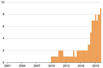 Number of projects under construction with an expected cost of at least $5 billion ($2020)
