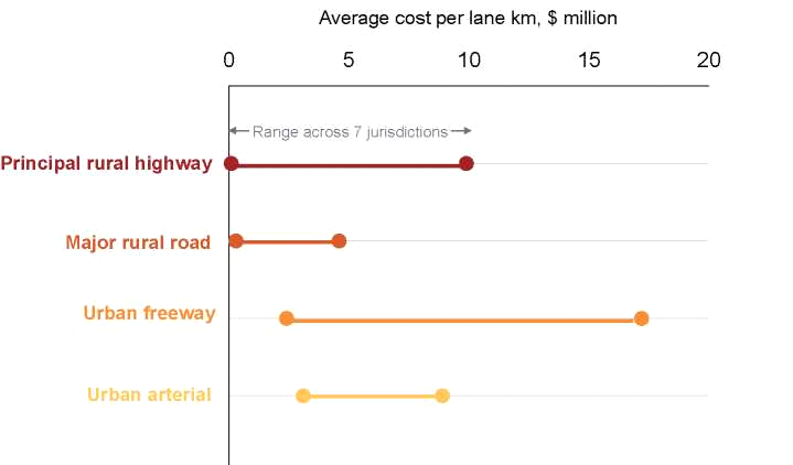 Notes: Costs per lane kilometre exclude property acquisition and supplementary costs. BITRE randomly assigned responding jurisdictions a number between 1 and 7. Tasmania did not provide data in 2017.