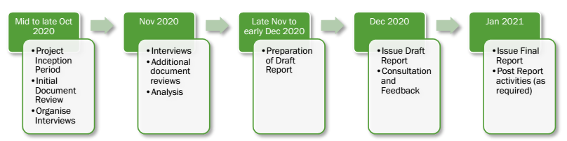 • An initial project inception phase focussed on an initial document review, preparation of a project inception report, developing an initial list of interviewees, developing interview questions to assist interviewees and scheduling interview sessions;