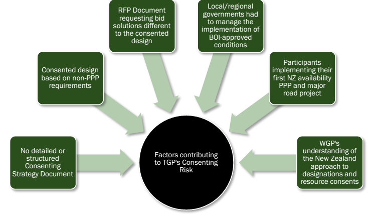 • The TGP Agreement risk allocation matrix reflected a contractual strategy that all consenting risk is transferred to the PPP Consortium. This contractual strategy appears fine in-principle, but it is an approach structured on a risk allocation of Board of Inquiry (BOI) approved consents rather than the different requirements that were set as part of the RFP documentation and which came to light during the Preferred Bidder phase (and eventually into the construction phase);