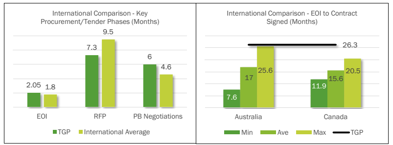 • The TGP's combined time of 15.35 months for EOI, RFP preparation and PB Negotiations was slightly less than the equivalent international average of 15.6 months.