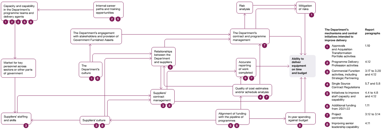 | Figure 2 Summary of factors affecting the performance of the Ministry of Defence's major equipment programmes and their contracts identified in this report The factors affecting the performance of the Ministry of Defence's (the Department's) equipment contracts and programmes are complex. It uses a range of mechanisms and initiatives to improve delivery