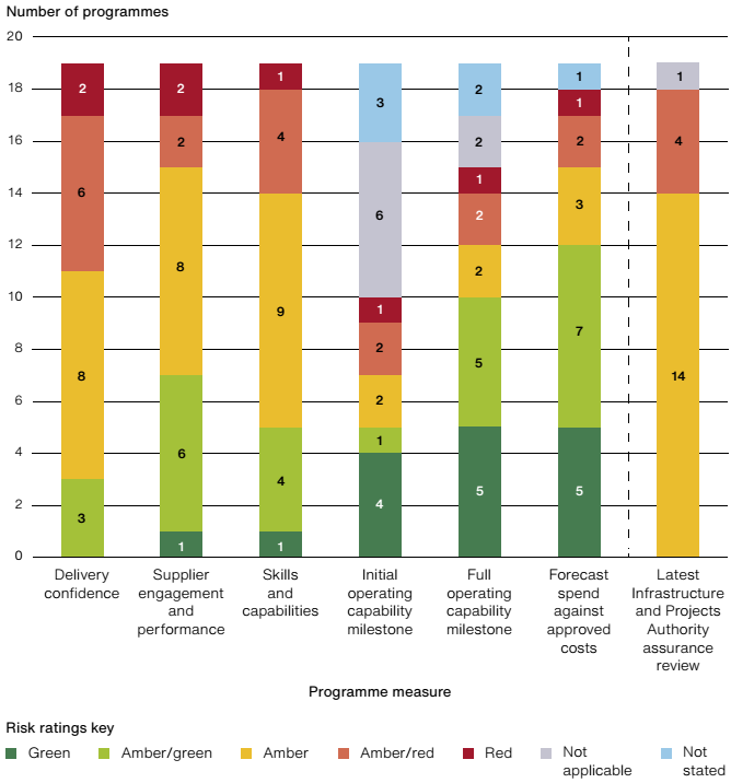 Notes 1 Data for the Infrastructure and Projects Authority's (IPA) assurance review ratings reflect the most recent delivery confidence assessment valid at quarter four 2020-21. The IPA has not reviewed the Ministry of Defence's (the Department's) Future Combat Air System Technology Initiative programme. 2 Four of the projects or programmes have achieved Initial Operating Capability and are therefore recorded as 'not applicable' for this measure. 3 The Initial Operating Capability and Full Operating Capability milestone measures are not applicable for two other programmes we examined: (1) Future Combat Air System Technology Initiative, because this is a research and development programme; and (2) the Department's Complex Weapons programme, because this is a rolling portfolio of individual weapons acquisitions. Source: National Audit Office analysis of Ministry of Defence documents |