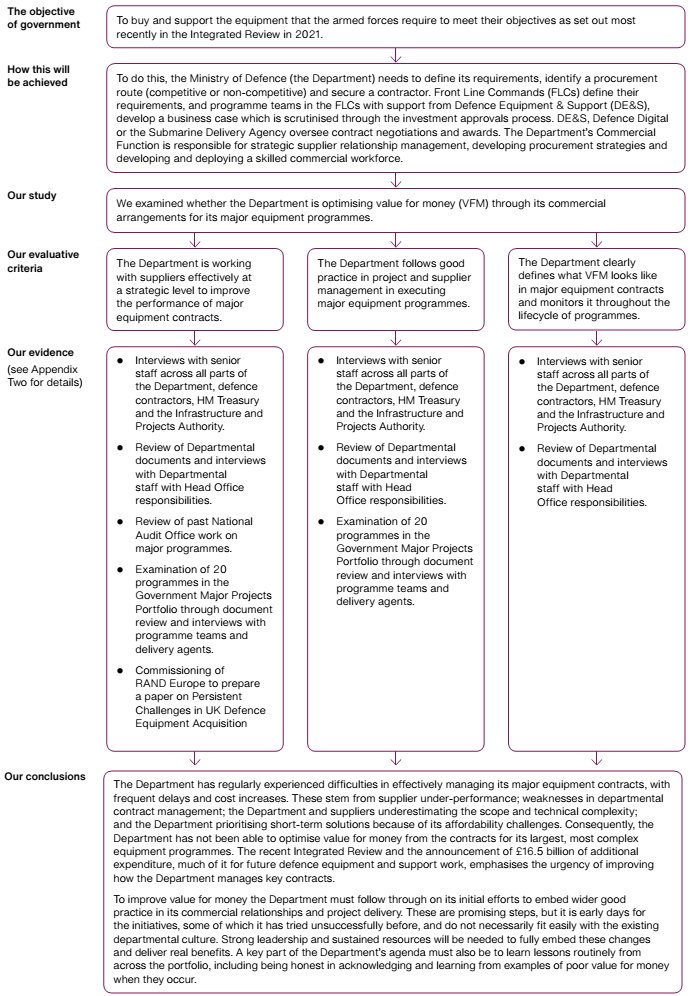 1 Our study examined whether the Ministry of Defence (the Department) optimises value for money (VFM) through its commercial and programme management arrangements for its equipment. We considered: