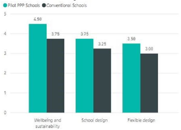 2.4 During the Principal interviews three questions were asked relative to the Architectural Review in relation to quality of the school design, flexibility of the space designed, and how well the building overall supported wellbeing. Overall, the Pilot PPP Schools Bundle scored higher against all categories (Figure 2.3), and similar to the NORR review, the range of responses received varied greatly across the Conventional Schools. With regards to qualitative feedback received, this was very similar across both groups who noted the lack of social and corridor space however were cognisant of the fact that school design has progressed over the last two decades.