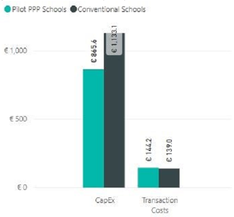 2.7 The Pilot PPP Schools Bundle construction costs are 24% lower than the Conventional School costs, whereas PPP transaction costs are 4% higher than Conventional School costs. When considered together, PPP CAPEX costs are 21% lower (Figure 2.4).
