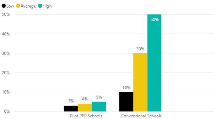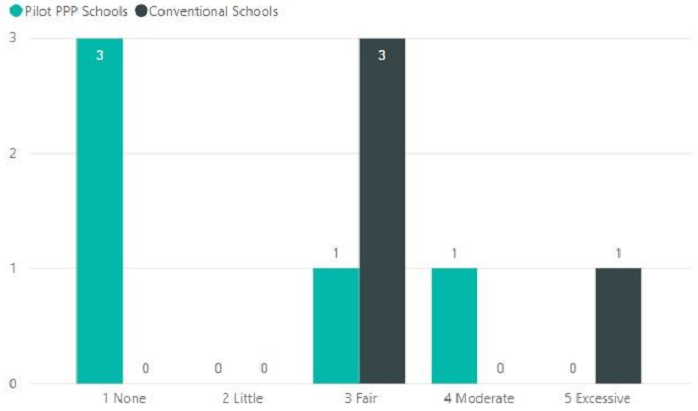 2.61 During the Principal interviews for both comparator groups, AAP asked each Principal what percentage of their time was spent on building/maintenance management (Figures 2.18 and 2.19). There was clear demarcation between the Pilot PPP Schools Bundle and the Conventional Schools, with the Pilot PPP Schools reporting little to no admin time (<5%) spent on maintaining the facilities, in contrast to the Conventional Schools spending a fair to moderate amount of time (>10%). For the Conventional Schools, there are also significant peaks and troughs in the administrative burden, rising from a base of 10% to 25-50%. Higher levels of administrative burden were typically related to increased levels of works at the schools, extensions, or other maintenance requirements. Two of the five Pilot PPP Schools noted that a low requirement for administrative time has not always been the case, with intervention needed in previous years to ensure accountability and contract compliance.