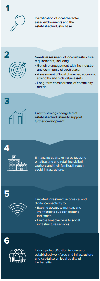 In considering these national priorities, the Australian Government and state and territory governments should consider local attributes when directing funding to regions. It is important to value each settlement's unique series of features, many of which will ultimately support national objectives.