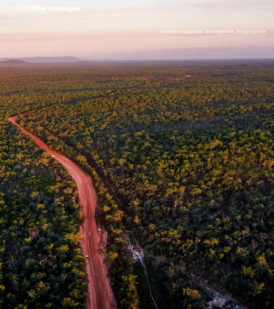 Key messages • Targeted reform and investment to develop Northern Australia can boost national economic growth, industry productivity and energy security and reinforce national security. • Infrastructure investment in Northern Australia presents specific challenges, including extreme climate, diverse environments and economies and low population density. • There needs to be better data to inform decision-making, including on population, the environment, natural resources and infrastructure requirements. • Economic growth will require access to a highly skilled labour force and engagement of local workers, including Aboriginal and Torres Strait Islander peoples. • Aboriginal and Torres Strait Islander communities' participation is essential for northern economic development. Infrastructure investment is needed in these communities to improve their economic participation and wellbeing. • Infrastructure needs to be designed, delivered and scaled to meet the requirements of diverse settlements that range from small cities to remote communities. • Enhancing connectivity and liveability is necessary so Northern Australia can attract and retain skilled workers and their families and provide adequate services to remote communities |