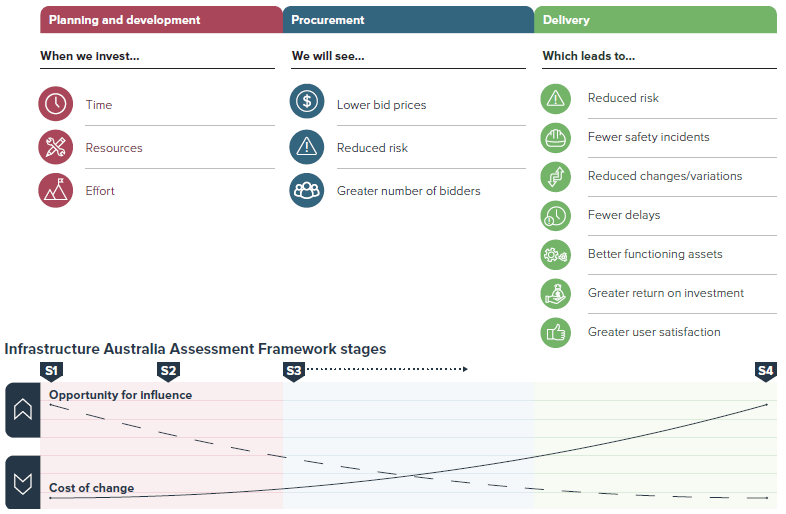 Realising the benefits of FEED requires systems, capability and commitment early in project planning and development (see Figure 3.3). Leadership and support across governments is required to ensure the benefits are protected against early project or delivery announcements, premature budget estimates or design solutions without appropriate scoping.