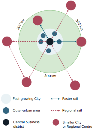 Smaller Cities and Regional Centres grow with strong connections to established and emerging centres in a Fast-growing City. Within 300 km, faster rail delivers 90-minute Journeys.