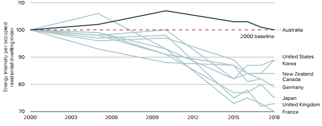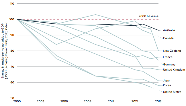 The graph also demonstrates the untapped potential of energy efficiency measures in Australia compared to such countries as New Zealand and those in the United Kingdom, which have greatly improved energy efficiency in the last 20 years.