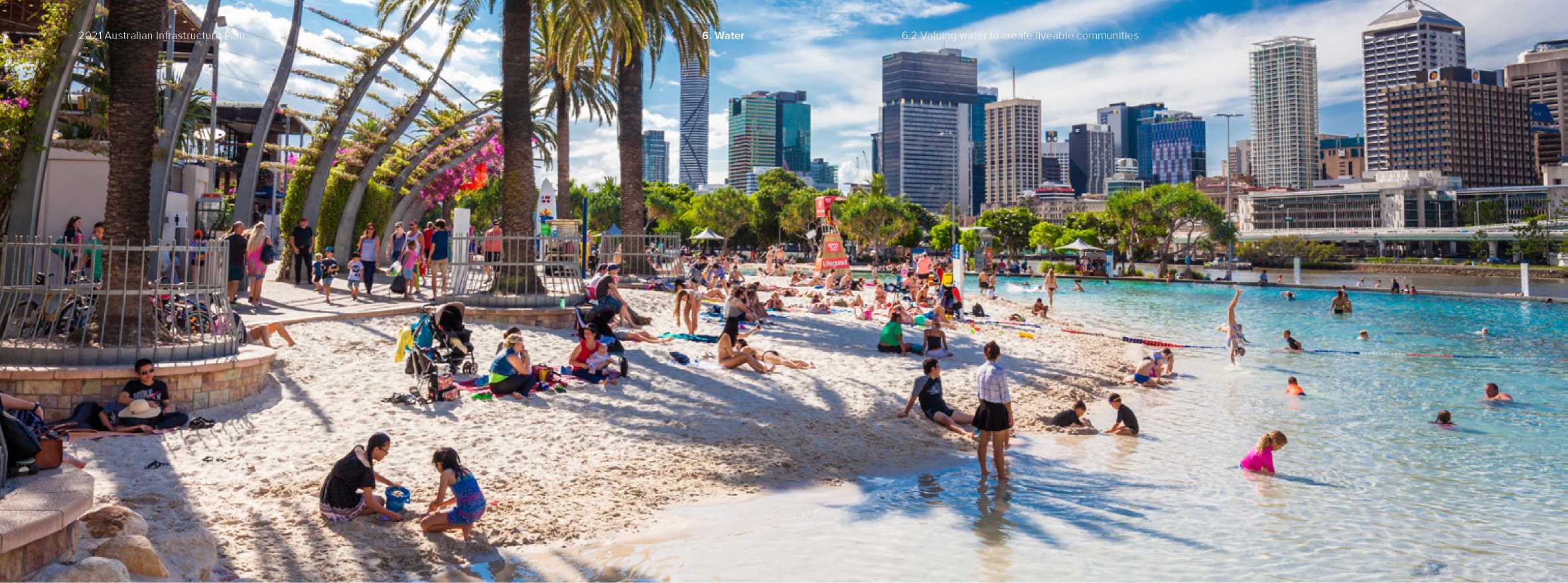 Key messages • The water sector is central to ensuring the liveability and resilience of Australia's urban environments. • Australians value water-dependent urban features, including parks, sporting fields and urban waterways. • Integrating management of water infrastructure and incorporating water managers into urban planning helps ensure the benefits of water in urban environments can be maximised. • High-quality water is essential to meet basic human needs. • High-quality water is also critical for strengthening Australians' health and wellbeing, ensuring economic prosperity and supporting sustainable development. • All Australians have a right to safe, high-quality reliable water and wastewater services.42 • The Australian Government recognises this right and the commitment in the 2020 National Agreement on Closing the Gap and in its pledge to the United Nations' Sustainable Development Goals.43 44 |