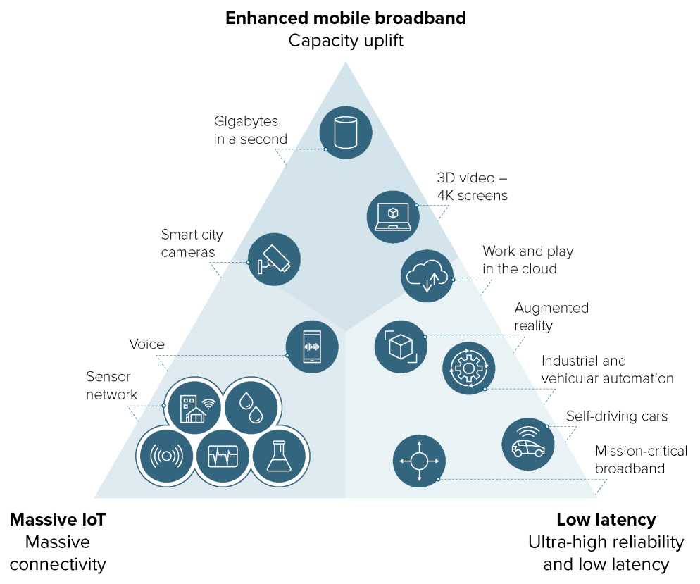 • Enhanced mobile broadband (eMBB): Mobile broadband over 5G enables very large volumes of data transfer at extremely fast speeds, with data typically exchanged using mobile phones, tablets and mobile broadband connections.