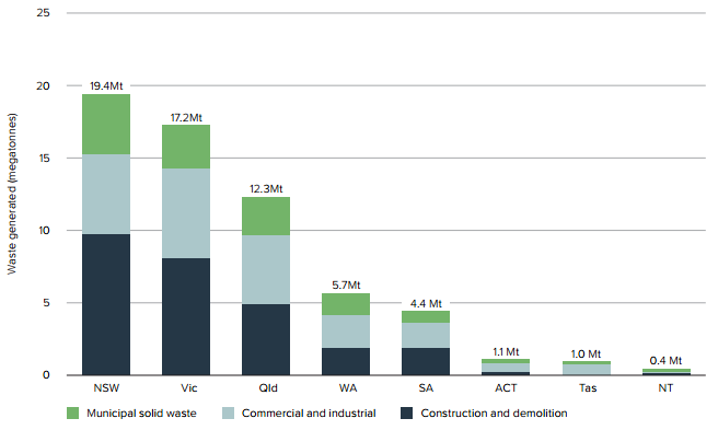 Unprecedented levels of investment in housing and infrastructure have also generated record volumes of construction and demolition waste in recent years.4 Municipal solid waste and commercial and industrial waste have also grown, but more slowly.5 With a projected population of 37 million people in 2050, Australia's waste production could rise to 81 megatonnes a year by then.6