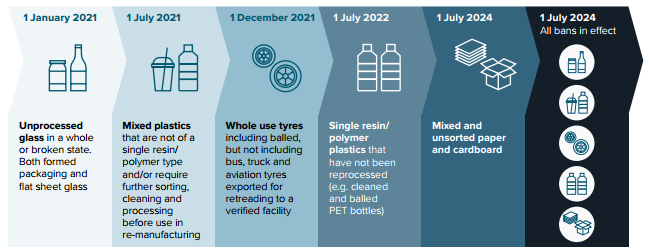 A staged timetable for different waste types begins in 2021, and most waste materials will need to be managed or pre-processed (in preparation for export) domestically by July 2024 (see Figure 9.2).15