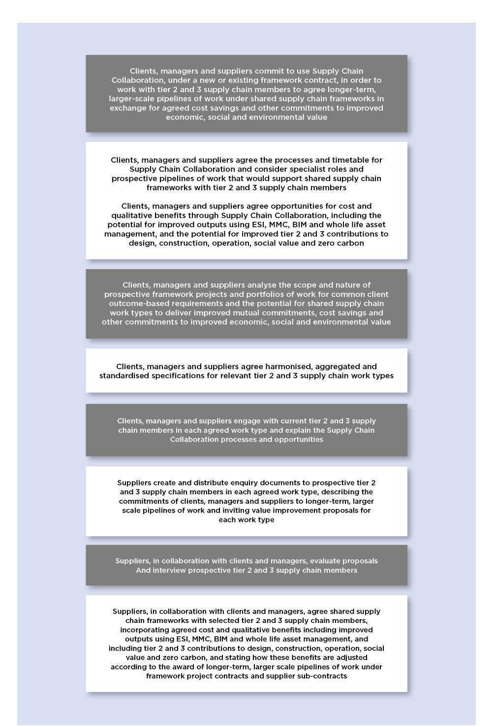 A Gold Standard framework contract needs to describe the process of Supply Chain Collaboration in sufficient detail to ensure that the framework provider, clients, manager and suppliers: