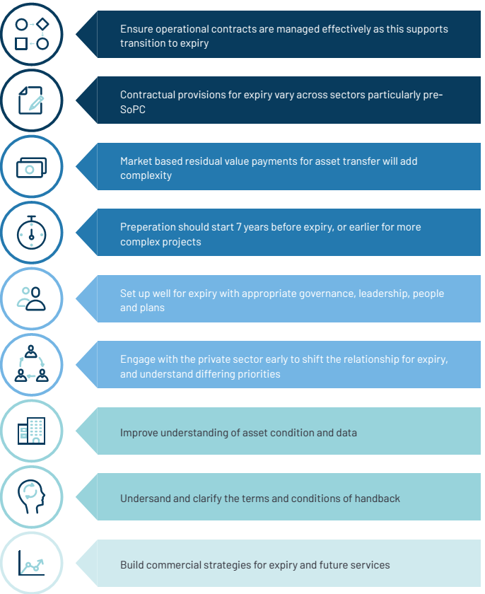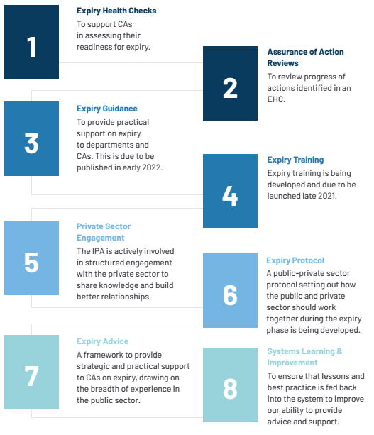 In response to the learnings identified in the evaluation of the 52 completed EHCs the IPA's PFI CoE has published Managing the Risks of PFI Contract Expiry. This sets out our plans to embed the lessons learnt and how we will support CAs to develop and execute successful expiry projects. The key offerings in our support plan are: