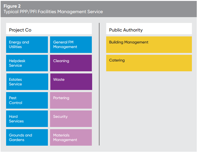 In terms of the FM service, the scope of service contracted out to Project Co is generally comprehensive (i.e. a turnkey FM solution). The diagram below illustrates the number of services that generally reside with Project Co and its sub-contractor, the FM provider.