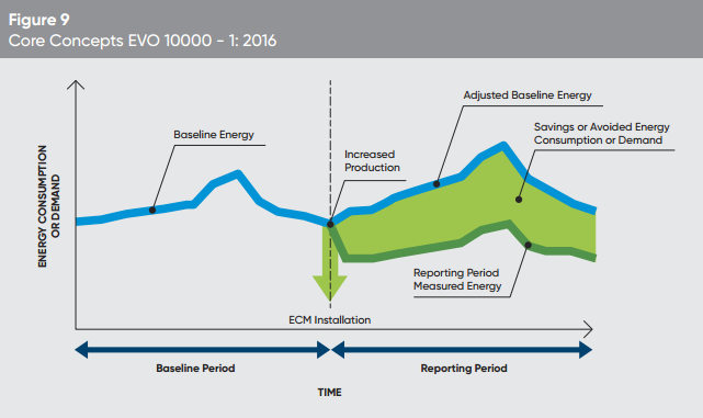 Two key concepts form the basis for IPMVP. The first is that the post project consumption is not compared with a fixed baseline but with an estimate of what the energy consumption would have been under the conditions after implementation of the project. This requires an understanding of the factors which are driving the energy use (e.g. weather, building use, building occupancy) and developing a mathematical model to relate energy to the relevant factors. The baseline energy is then adjusted according to the level of these factors in the post-installation (reporting) period. This is illustrated in Figure 8 where an increase in production post baseline has led to an upward adjustment of the baseline energy being applied, which is then measured against the actual reported energy to determine savings or avoided energy consumption.