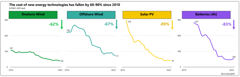 Figure 1 - The global cost of onshore wind, offshore wind, solar, and batteries 2010-2022 (Source: BNEF)