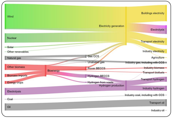 43. Recent changes have not significantly affected the mixture of technologies required for reaching net zero. The updated analysis conducted for the Review shows that the cost-minimising technological mix for net zero in 2050 scenarios is similar to what the Government expected in late 2021 (see Figure 4 below, visually very close to the equivalent scenario shown in the Net Zero Strategy). In the extreme scenario modelled, the new results see more energy being delivered through power and less by hydrogenvi and an increase in the proportion of green hydrogen vs. blue.vii Given long-term uncertainty and the use of an extreme scenario in this modelling, these variations do not suggest a need to alter current targets or policy - but remind us that modelling should be done at regular intervals to check the optimal system design at more recent fossil fuel prices.