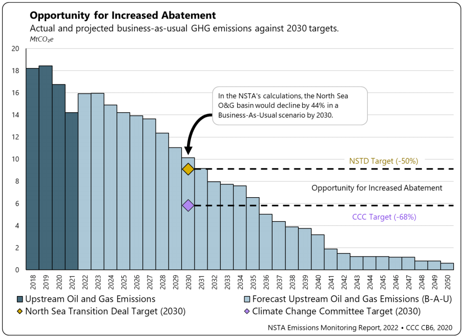 367. The Climate Change Committee's (CCC) optimal pathway for reduction in upstream oil and gas emissions by 2030 is 68%, from 2018 levels.282 This is significantly more ambitious than the 50% for 2030 target that was agreed by industry, government and the NSTA in the NSTD.