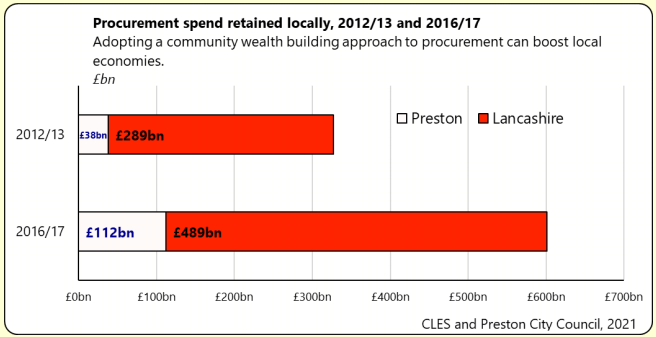 CASE STUDY: Local Net Zero Investment The transition to net zero can be supported by driving innovation in the local private sector to ensure that the opportunities of net zero lead to real benefits for local communities in terms of jobs, skills and pride in place. Preston in Lancashire is regarded as one of the UK's pioneers of community wealth building, an approach to local economic development focused on using a community's existing assets to create inclusive and local growth. Since 2012 the City Council has worked with other 'anchor institutions' in Preston - such as NHS trusts, universities, housing associations, and large local businesses - to use its influence as an employer, an owner of land and other assets, a major purchaser of goods and services and as a leader of place to reduce the wealth flowing out of the local economy so that it can be retained and shared more widely for the benefit of local people. The figure below shows Preston's success in using community wealth building to retain procurement spend locally. Compared to place-agnostic procurement in 2012/13, prioritising procurement from local and socially responsible businesses led to spend within Preston increasing from 5% to 18% of total procurement spend, and spend within Lancashire increasing from 39% to 79% of total procurement spend.