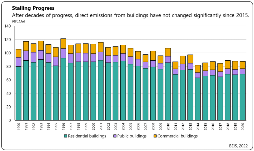 944. Homes are at the heart of the net zero equation. The UK's ~30 million buildings are responsible for ~30% of our greenhouse gas emissions. Direct greenhouse gas emissions from buildings (largely combustion of fuels for heating) currently make up ~20% of UK territorial emissions.664 Progress has been made in reducing indirect greenhouse gas emissions from the home (e.g., appliances, lighting, catering etc.), as the power sector has decarbonised, but direct emissions from heating have not changed significantly since 2015, as per the figure below.665
