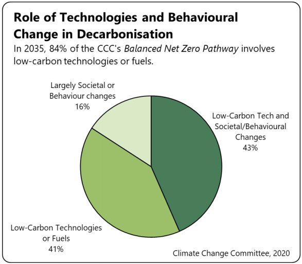 1020. Through its world-leading university and research sector, the UK is well positioned to play an important global role in net zero R&D and technology innovation.720 Of the actions that must be taken to deliver on the UK's 2035 decarbonisation ambitions, 84% requires low carbon technologies or fuels in combination with behavioural change (Figure 6.1).721 The Climate Change Committee (CCC) has estimated that additional capital investment into low carbon technologies and infrastructure needs to reach £50-£60 billion per year by the early 2030s to meet the UK's net zero targets.722