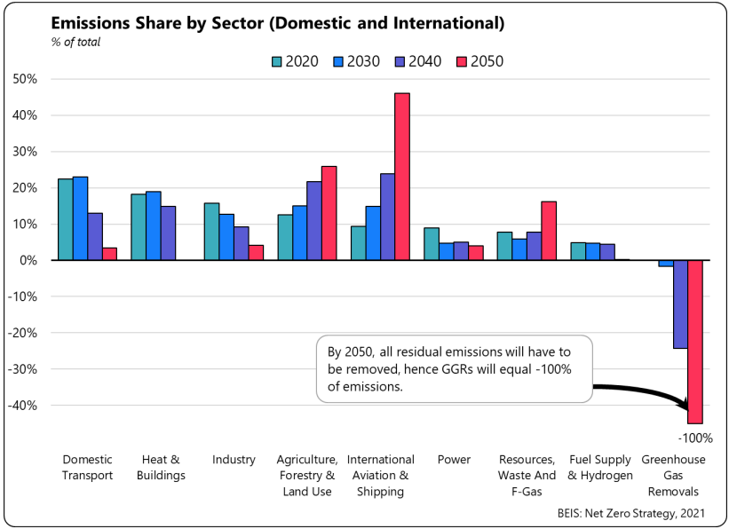 1072. By 2030, the current sectors covered by the UK ETS will only cover 18 % of UK territorial emissions766 and as the table below shows, sectors such as agriculture and international aviation and shipping will continue to increase their share of the UK's emissions towards 2050 as other sectors decarbonise. This highlights the need to expand the scope of the UK ETS in order to ensure a meaningful carbon market of sufficient magnitude and further encourage other sectors to decarbonise.